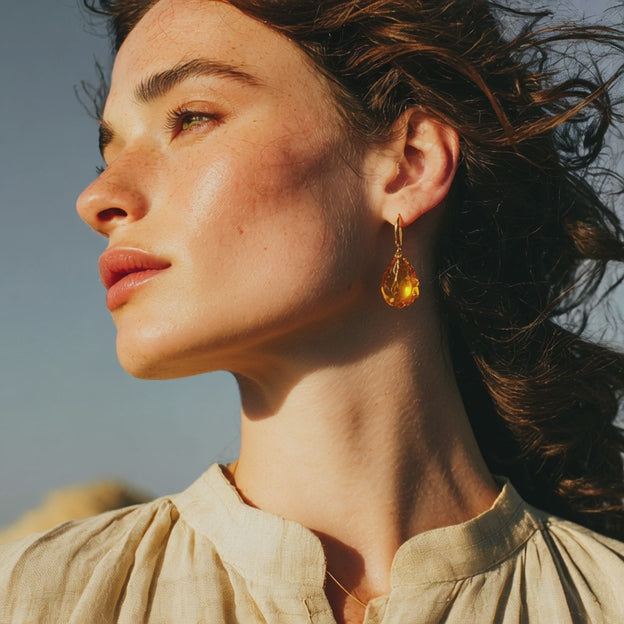 Delicate drop earrings crafted from golden-infused glass and brass, echoing the warmth and sweetness of honey. Accented with amber fragments.